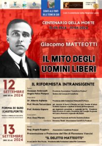 Una “Pattuglia” di Socialisti di Castelforte, con un Centro Culturale Presieduto da Giuseppe Ambroselli, con Paolo Ciorra, Domenico Tipaldi e Antonio D’Onofrio, hanno il piacere di invitare tutti noi a due serate (12 e 13 settembre, alle 20,30, in località FORMA di SUIO, con la partecipazione di autorevoli Socialisti, presentando la figura del nostro fondatore e con la proiezione del Film “Il delitto Matteotti”. E’ obbligo morale la nostra partecipazione ricorrendo quest’anno il centenario del Suo assassinio.